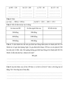 Câu 1. Đặt tính rồi tính: a) 493 – 128 b) 123 + 205 c) 752 – 48 d) 137 + 83 ………………. ………………. ………………. ………………. ………………. ………………. ………………. ………………. ………………. ………………. ………………. ………………. Câu 2. Tính: a) 1 km …. 500 m + 450 m