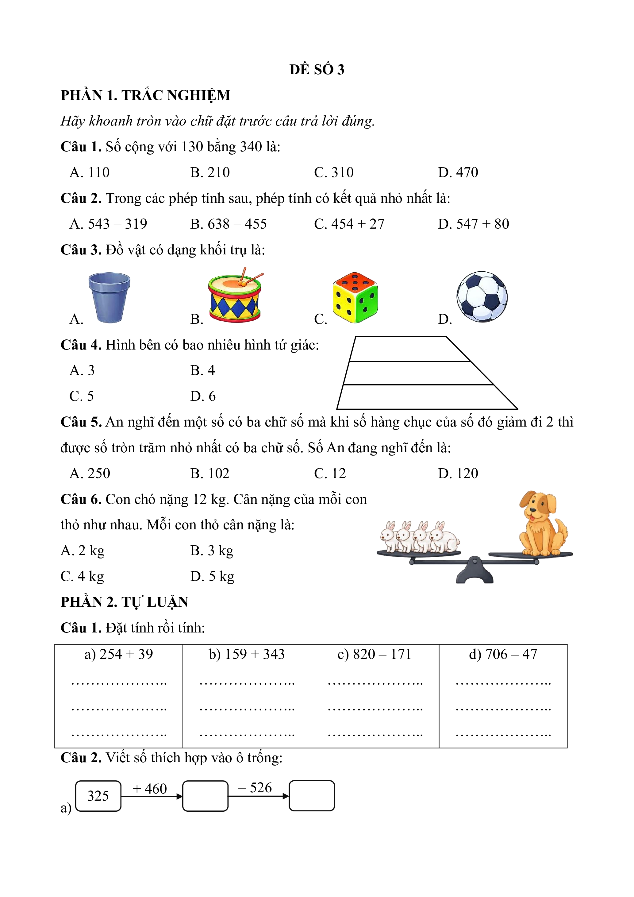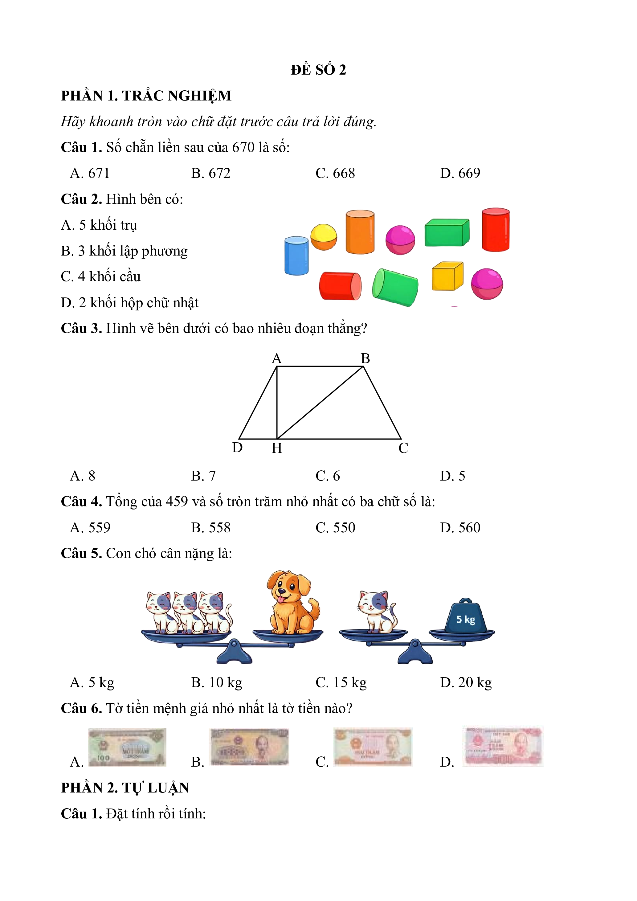 Câu 1. Số chẵn liền sau của 670 là số: A. 671 B. 672 C. 668 D. 669 Câu 2. Hình bên có: A. 5 khối trụ B. 3 khối lập phương C. 4 khối cầu D. 2 khối hộp chữ nhật