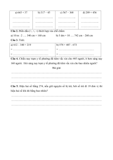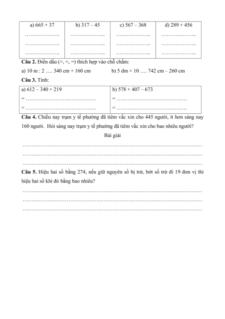 Câu 1. Đặt tính rồi tính: a) 665 + 37 b) 317 – 45 c) 567 – 368 d) 289 + 456 ………………. ………………. ………………. ………………. ………………. ………………. ………………. ………………. ………………. ………………. ………………. ……………….