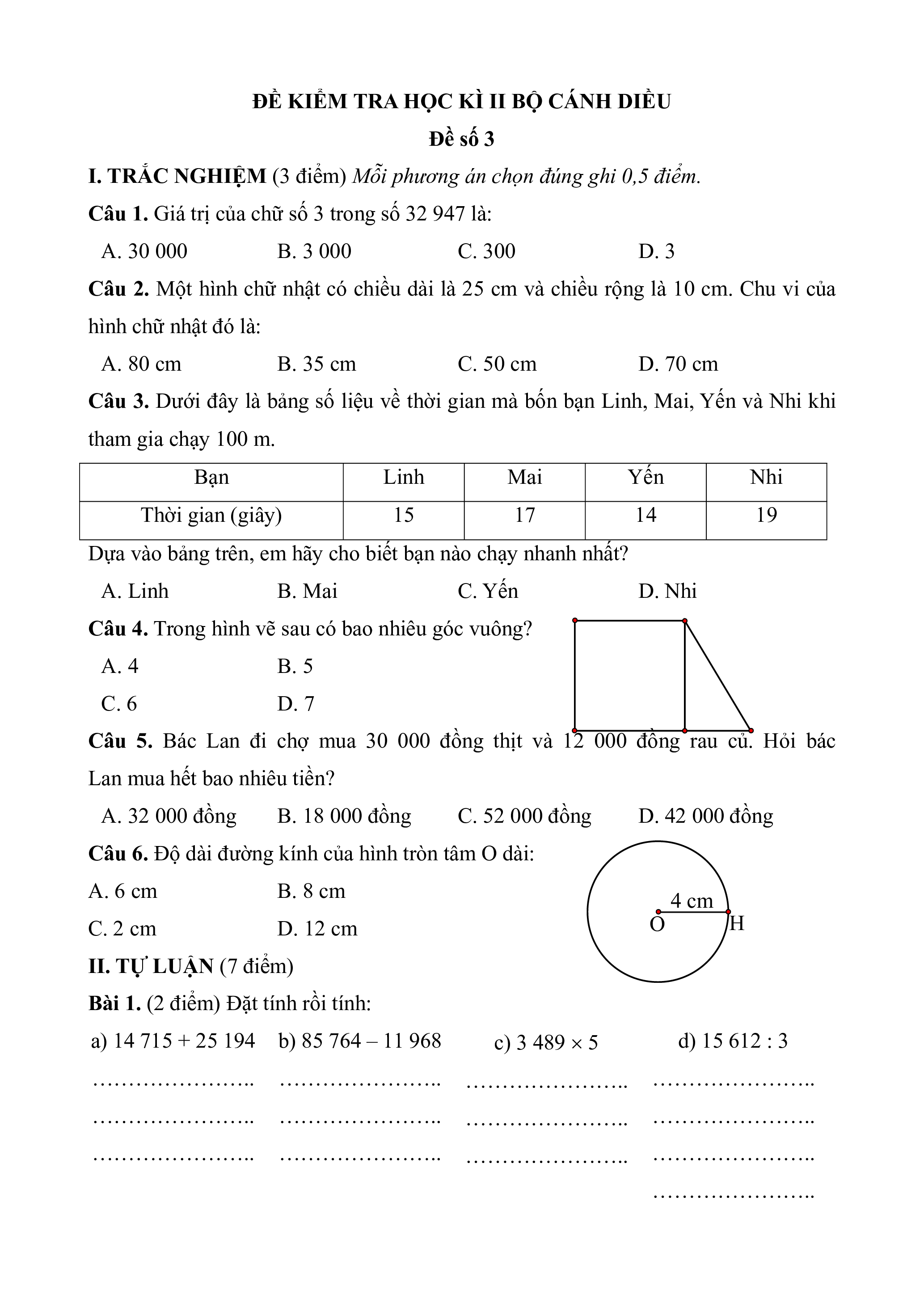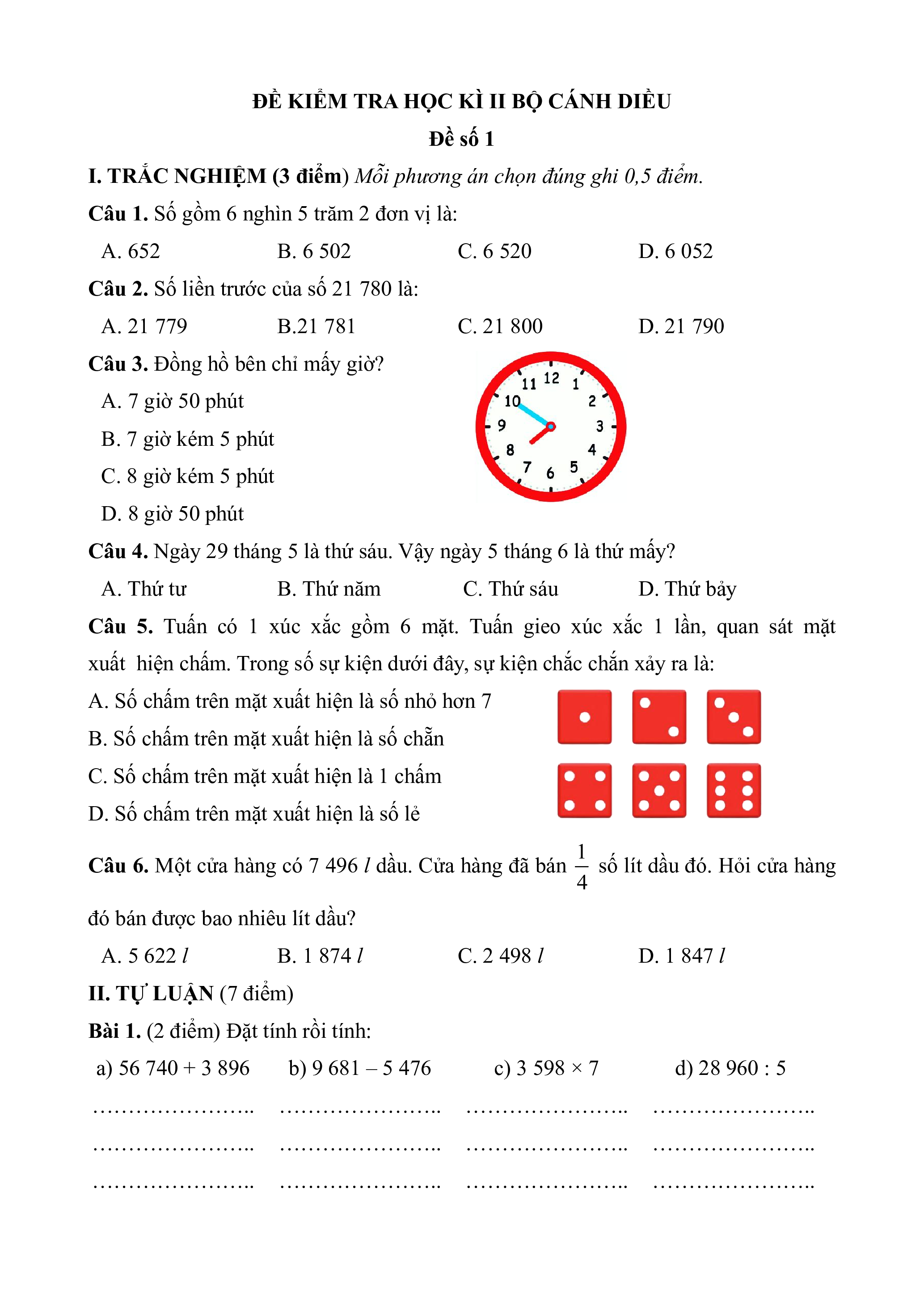 Bộ 30 đề thi cuối kì 2 Toán lớp 3 Cánh diều có đáp án
