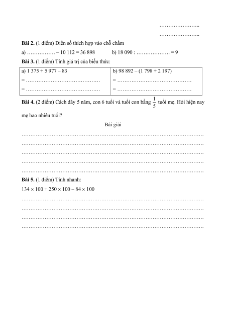 Bài 3. (1 điểm) Tính giá trị của biểu thức: a) 1 375 + 5 977 – 83 b) 98 892 – (1 798 + 2 197)