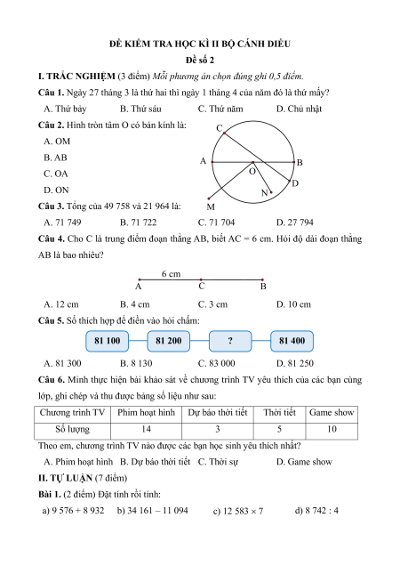 ĐỀ KIỂM TRA HỌC KÌ II BỘ CÁNH DIỀU Đề số 2