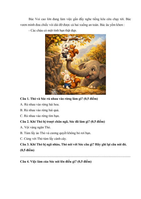 Câu 2. Khi Thỏ bị trượt chân ngã, Sóc đã làm gì? (0,5 điểm)
