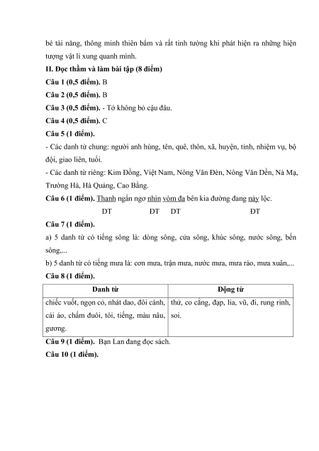 Câu 8. Em hãy tìm các động từ, danh từ có trong đoạn văn sau rồi điền vào bảng: (1 điểm)