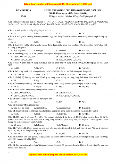 Bài thi: Khoa học tự nhiên; Môn: Hóa Học SỐ 18