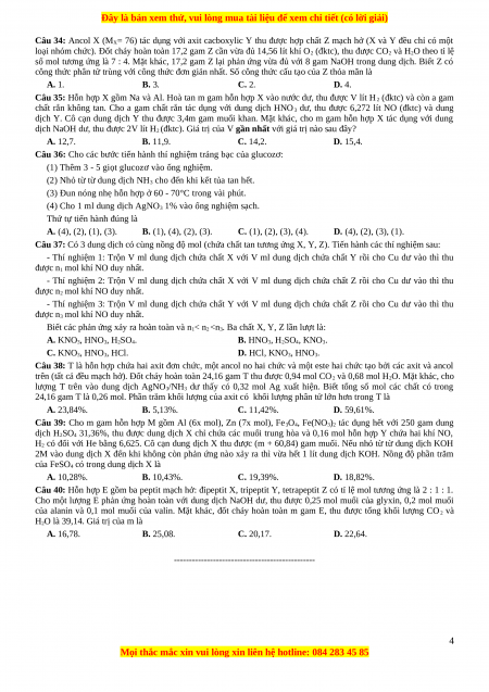 Câu 34: Ancol X (MX= 76) tác dụng với axit cacboxylic Y thu được hợp chất Z mạch hở (X và Y đều chỉ có một