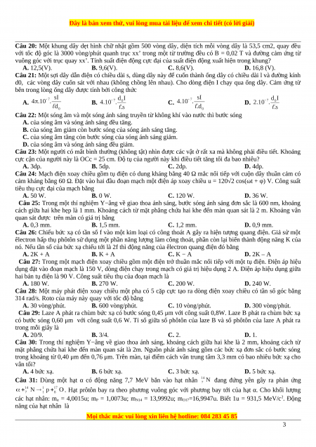 Câu 20: Một khung dây dẹt hình chữ nhật gồm 500 vòng dây, diện tích mỗi vòng dây là 53,5 cm2, quay đều