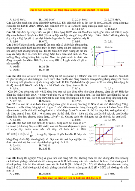 Câu 32: Cho mạch dao động điện từ lý tưởng LC. Khi điện tích trên tụ lần lượt là 1mC, 2mC thì dòng điện qua