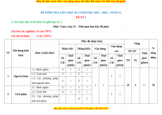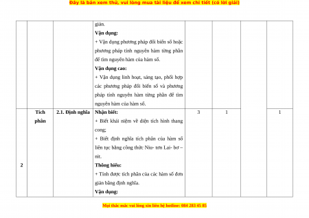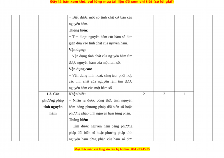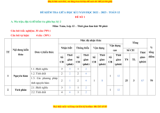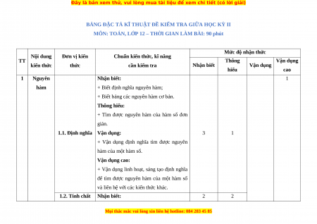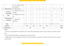 Đơn vị kiến thức Thời tổng thức Thời Thời Thời Thời Số Số Số Số gian điểm gian gian gian gian TN TL CH CH CH CH (phút) (phút) (phút) (phút) (phút) 1.1. Định nghĩa 3 3 1 2 1.2. Tính chất 2 2 2 4 1 Nguyên hàm 1 12 1.3. Các phương pháp 2 1 2 4 1 8 25 3 67 70 tính nguyên hàm 2.1. Định nghĩa 3 3 1 2 2 Tích phân 1 12 2.2. Tính chất 4 4 1 2
