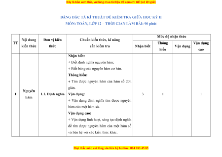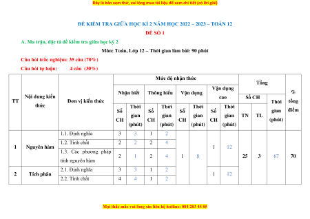 Đơn vị kiến thức Thời tổng thức Thời Thời Thời Thời Số Số Số Số gian điểm gian gian gian gian TN TL CH CH CH CH (phút) (phút) (phút) (phút) (phút) 1.1. Định nghĩa 3 3 1 2 1.2. Tính chất 2 2 2 4 1 Nguyên hàm 1 12 1.3. Các phương pháp 2 1 2 4 tính nguyên hàm 1 8 25 3 67 70 2.1. Định nghĩa 3 3 1 2 2.2. Tính chất 4 4 1 2 2 Tích phân 1 12 2.3. Các phương pháp 4 8 tính tích phân