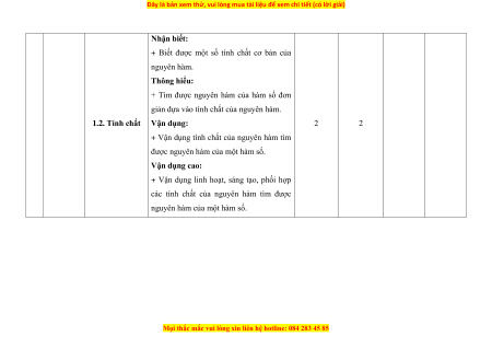 + Biết được một số tính chất cơ bản của nguyên hàm. Thông hiểu:
