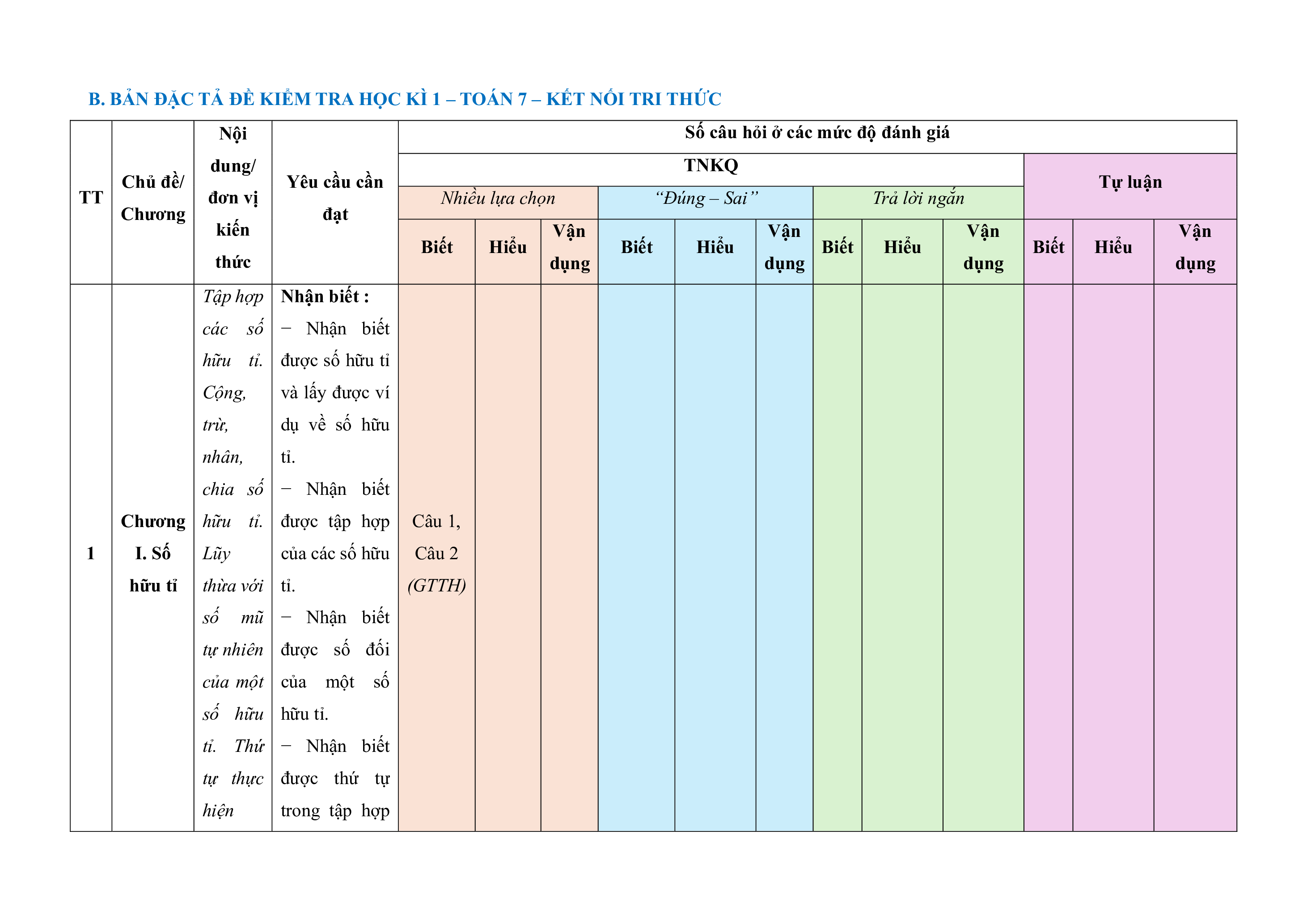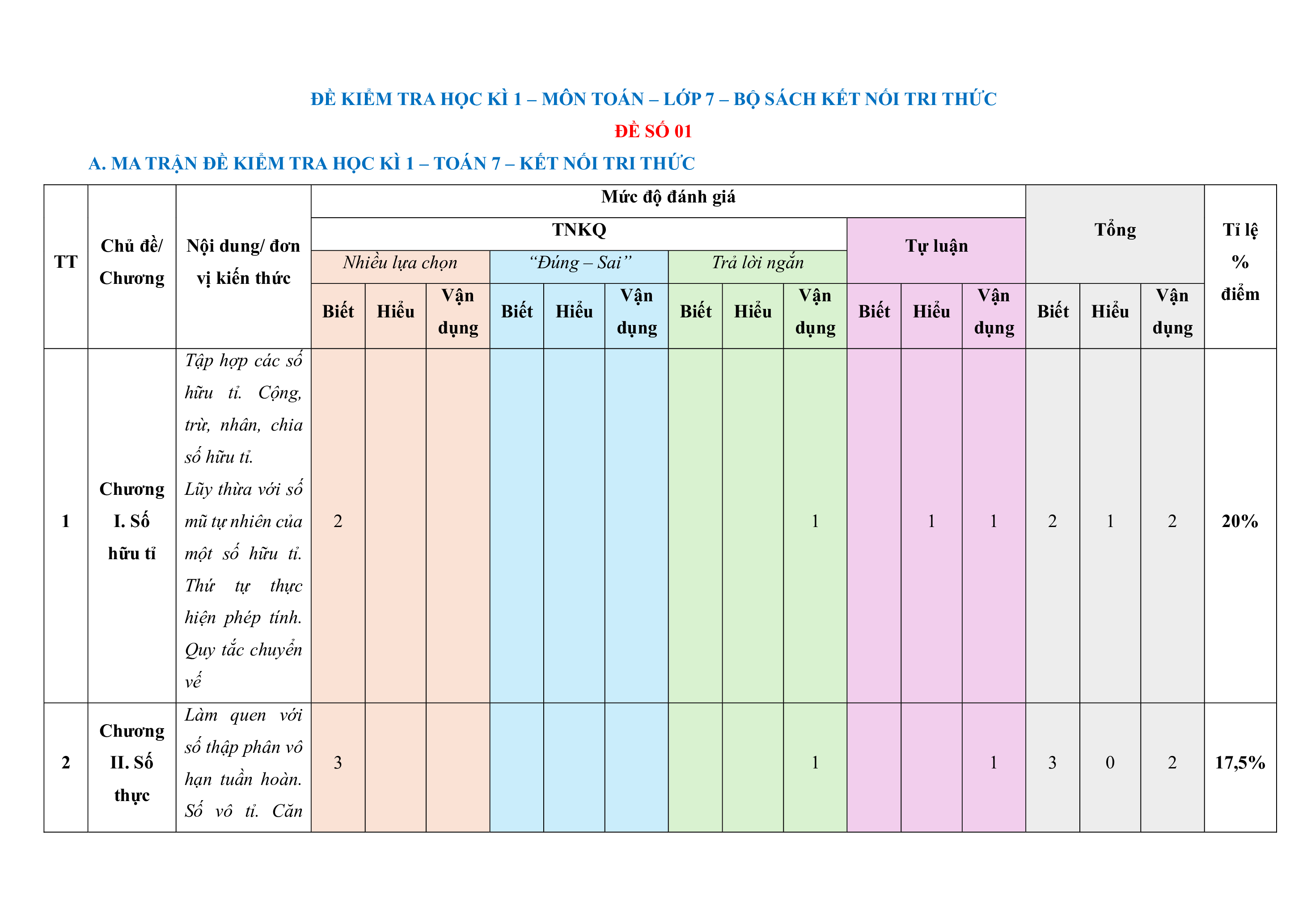 A. MA TRẬN ĐỀ KIỂM TRA HỌC KÌ 1 – TOÁN 7 – KẾT NỐI TRI THỨC