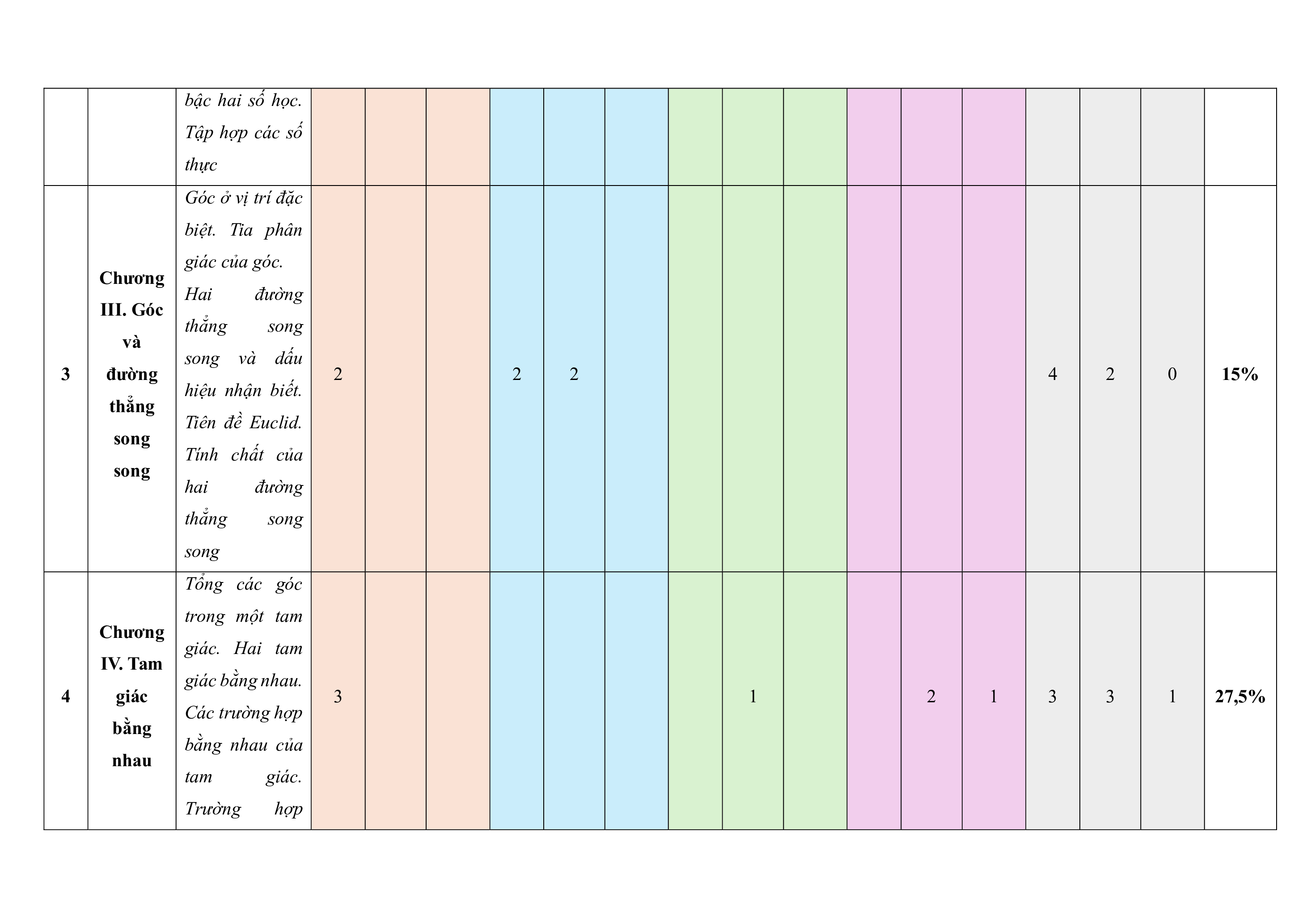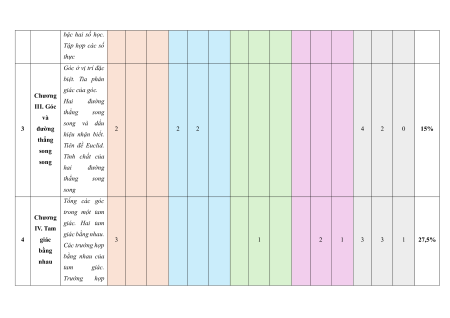 III. Góc thẳng song và song và dấu 3 đường 2 2 2 4 2 0 15% hiệu nhận biết. thẳng Tiên đề Euclid. song Tính chất của song hai đường thẳng song song Tổng các góc trong một tam