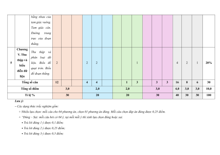 diễn dữ đồ đoạn thẳng. liệu Tổng số câu 12 4 4 1 3 3 3 16 8 6 30 Tổng số điểm 3,0 2,0 2,0 3,0 4,0 3,0 3,0 10,0 Tỉ lệ % 30 20 20 30 40 30 30 100 Lưu ý: