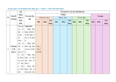 Chủ đề/ Nội dung/ đơn Tự luận TT Nhiều lựa chọn “Đúng – Sai” Trả lời ngắn % Chương vị kiến thức Vận Vận Vận Vận Vận điểm Biết Hiểu Biết Hiểu Biết Hiểu Biết Hiểu Biết Hiểu dụng dụng dụng dụng dụng Tập hợp các số hữu tỉ. Cộng, trừ, nhân, chia số hữu tỉ.