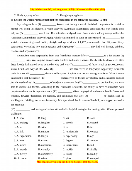 (15) ___________ and feelings of self-worth and offer helpful strategies for dealing with difficult personal challenges. 1. A. once B. long C. yet D. soon 2. A. prolong B. lengthen C. stretch D. expand 3. A. in B. with C. on D. in 4. A. link B. number C. relationship D. contact 5. A. expectation B. length C. expectancy D. age 6. A. level B. extent C. degree D. amount 7. A. aware B. conscious C. independent D. full 8. A. exactly B. casually C. luckily D. finally 9. A. merely B. completely C. totally D. readily 10. A. made B. taken C. given D. enjoyed