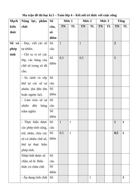 Ma trận đề thi học kì I – Toán lớp 4 – Kết nối tri thức với cuộc sống