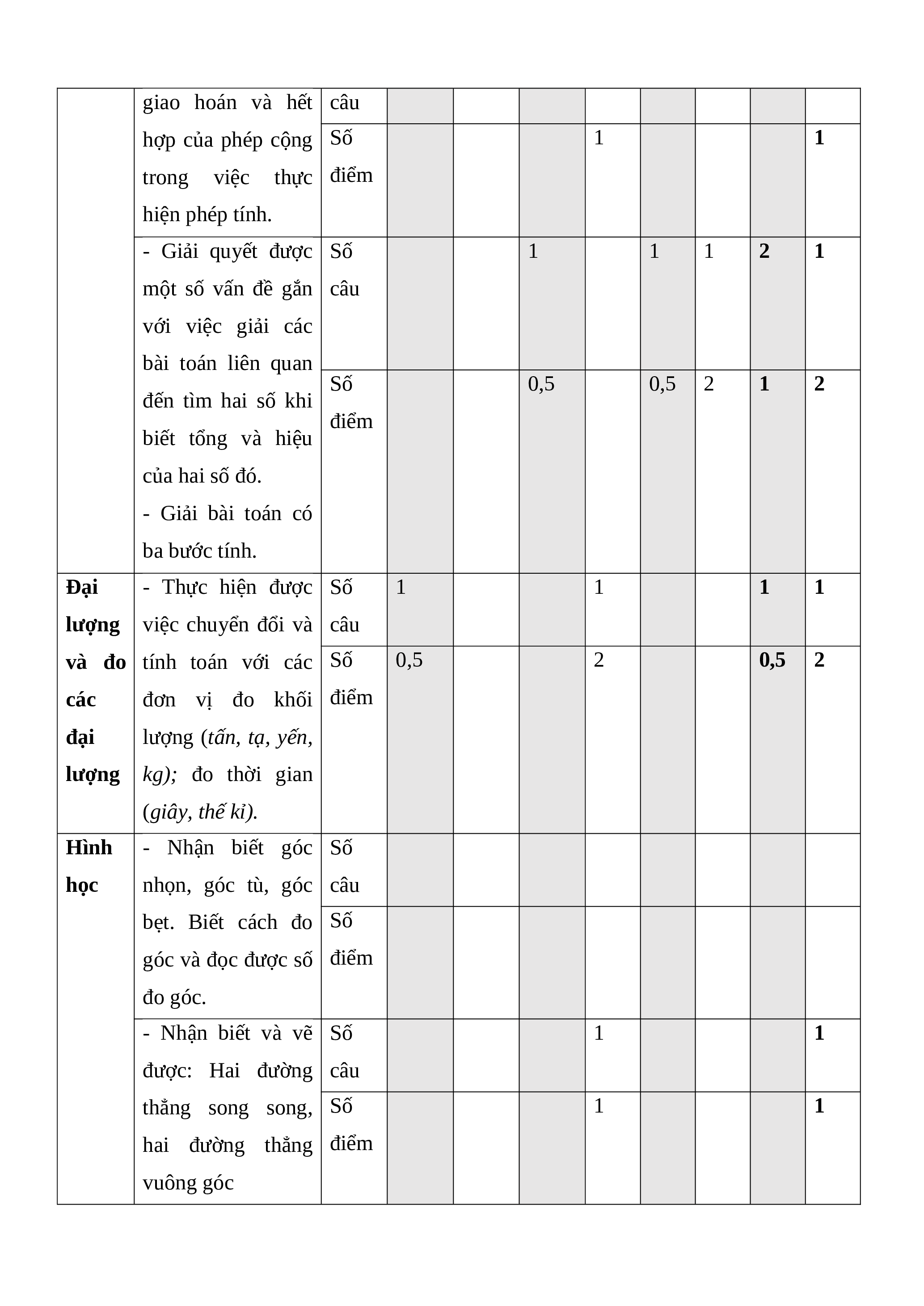 nhiên. (bé đến lớn Số hoặc ngược lại). điểm - Làm tròn số tự Số nhiên đến hàng câu trăm nghìn Số điểm - Thực hiện được Số 1 1 1 1 các phép tính cộng, câu trừ, nhân, chia các Số 0,5 1 0,5 1