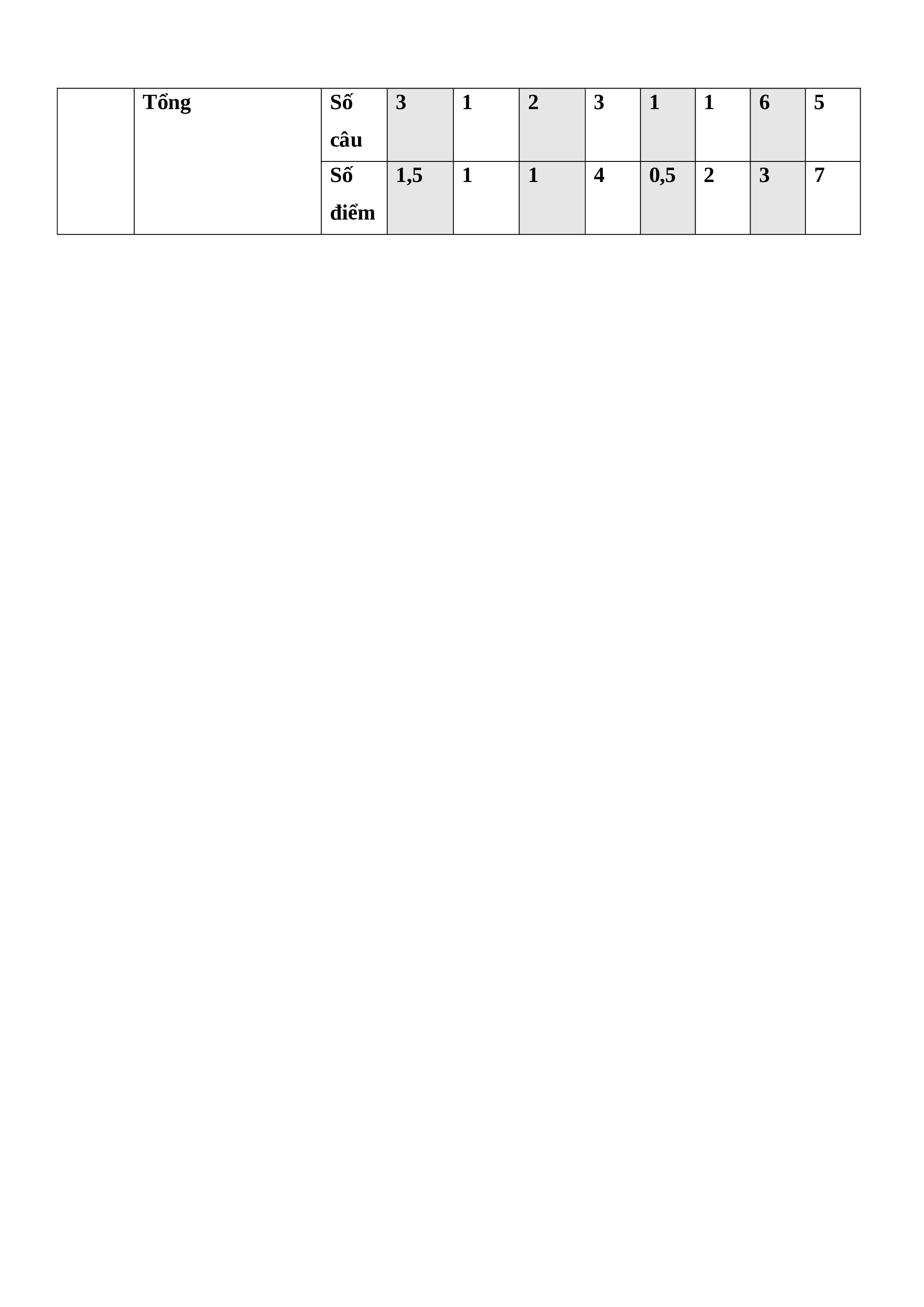 được: Hai đường câu thẳng song song, hai đường thẳng Số 1 1 điểm vuông góc Tổng Số 3 1 2 3 1 1 6 5 câu Số 1,5 1 1 4 0,5 2 3 7 điểm