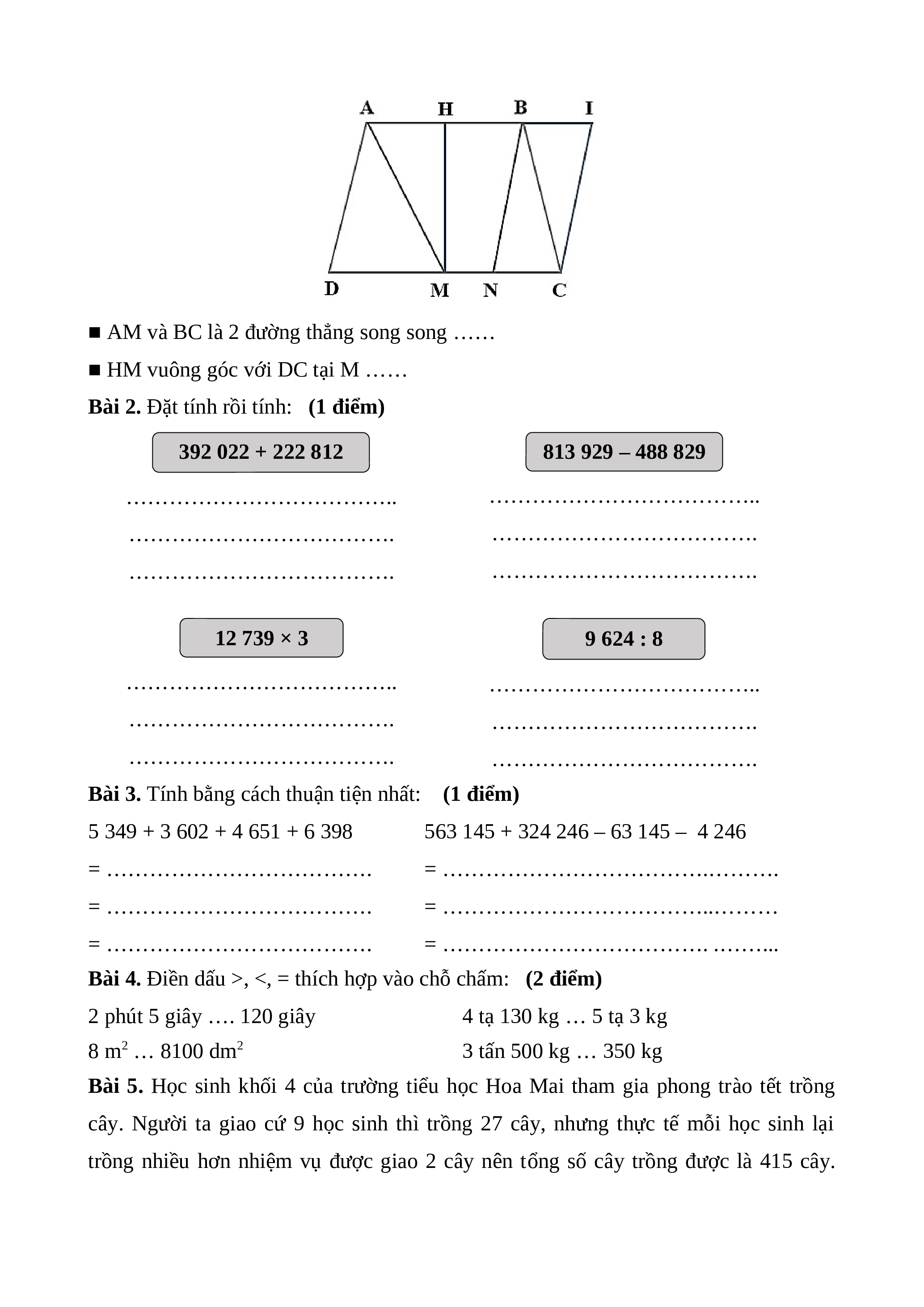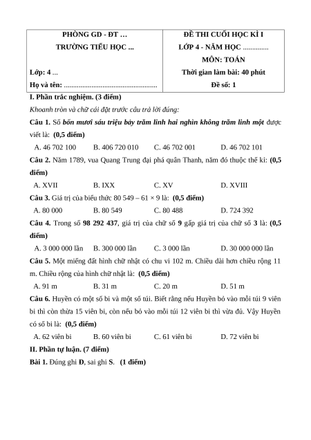 LỚP 4 - NĂM HỌC .............. MÔN: TOÁN Lớp: 4 ...
