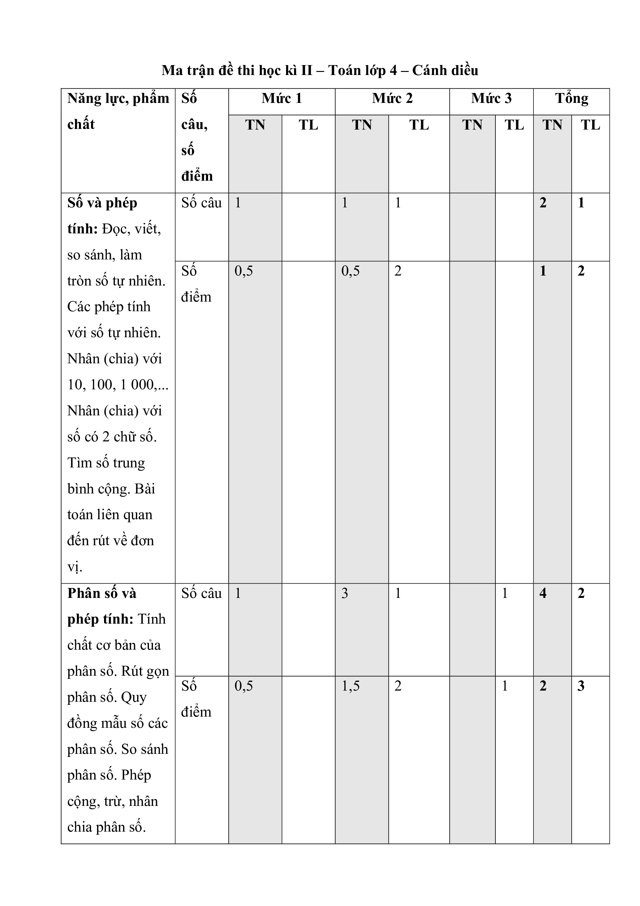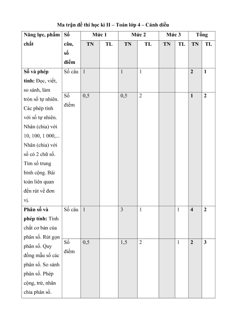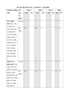 Ma trận đề thi học kì II – Toán lớp 4 – Cánh diều
