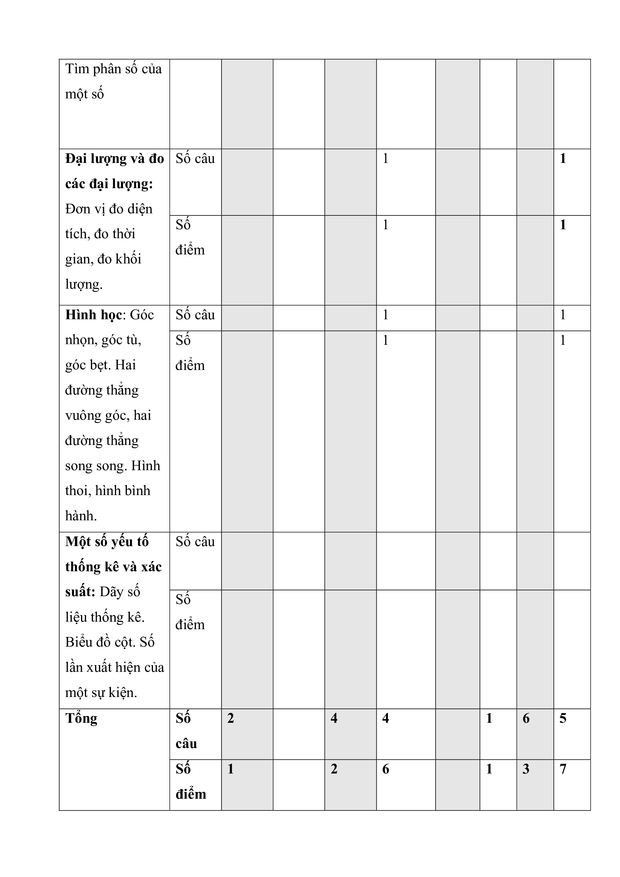 tròn số tự nhiên. điểm Các phép tính với số tự nhiên. Nhân (chia) với 10, 100, 1 000,... Nhân (chia) với số có 2 chữ số. Tìm số trung bình cộng. Bài toán liên quan đến rút về đơn vị. Phân số và Số câu 1 3 1 1 4 2 phép tính: Tính chất cơ bản của phân số. Rút gọn Số 0,5 1,5 2 1 2 3 phân số. Quy điểm đồng mẫu số các phân số. So sánh phân số. Phép cộng, trừ, nhân chia phân số. Tìm phân số của một số