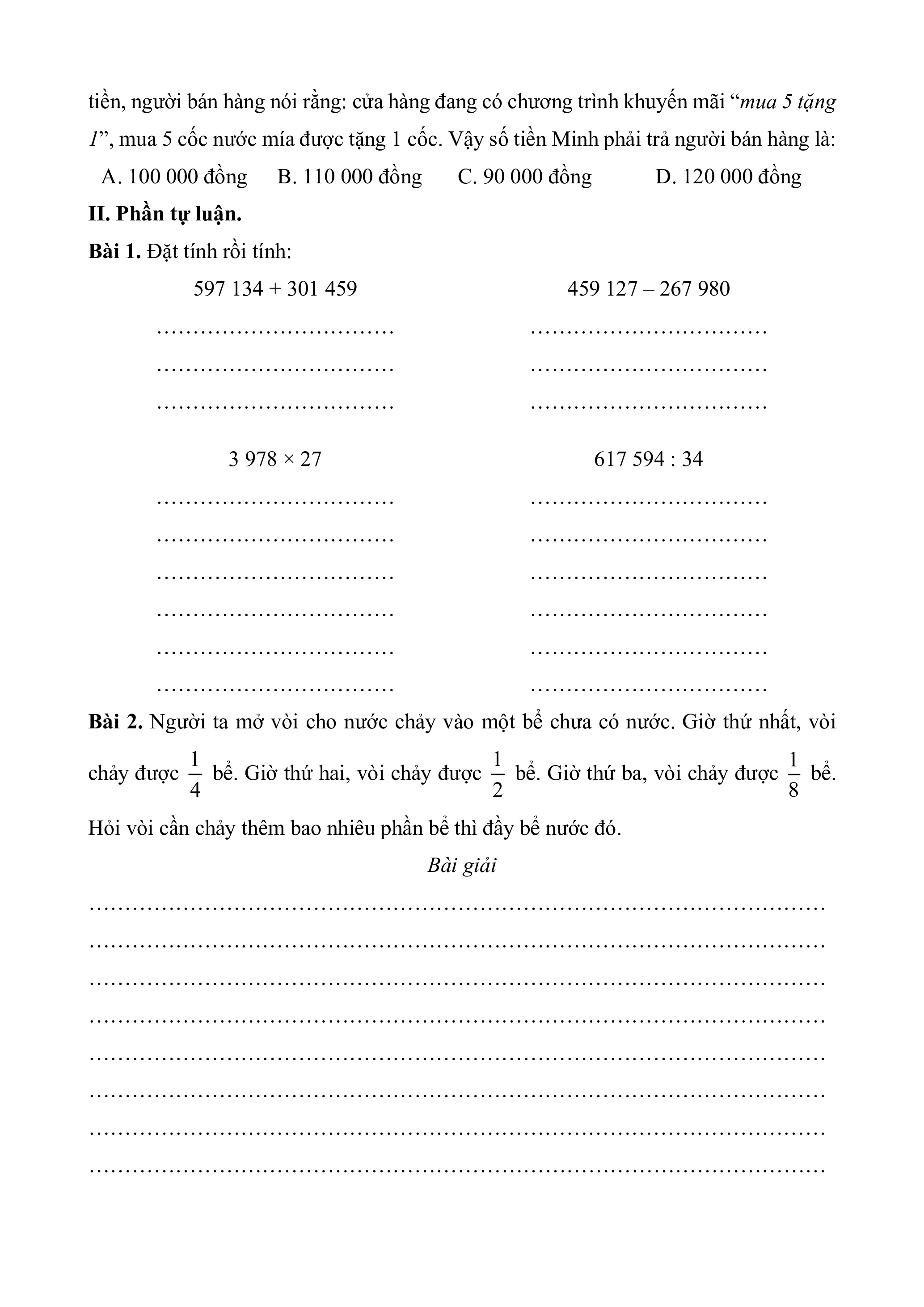 1”, mua 5 cốc nước mía được tặng 1 cốc. Vậy số tiền Minh phải trả người bán hàng là: A. 100 000 đồng B. 110 000 đồng C. 90 000 đồng D. 120 000 đồng