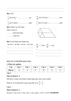 Đại lượng và đo Số câu 1 1 các đại lượng: Đơn vị đo diện Số 1 1 tích, đo thời điểm gian, đo khối lượng. Hình học: Góc Số câu 1 1 nhọn, góc tù, Số 1 1 góc bẹt. Hai điểm đường thẳng vuông góc, hai đường thẳng song song. Hình thoi, hình bình hành. Một số yếu tố Số câu thống kê và xác suất: Dãy số Số liệu thống kê. điểm Biểu đồ cột. Số lần xuất hiện của một sự kiện. Tổng Số 2 4 4 1 6 5 câu Số 1 2 6 1 3 7 điểm