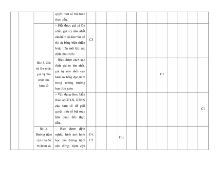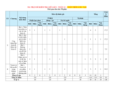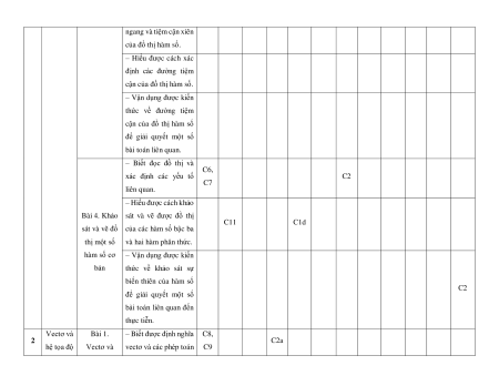Trả lời ngắn Vận Vận Vận Vận Vận Biết Hiểu Biết Hiểu Biết Hiểu Biết Hiểu Biết Hiểu dụng dụng dụng dụng dụng Bài 1. Tính đơn điệu và 2 1 1 1 1 4 2 17,5 cực trị của hàm số Bài 2. Giá trị lớn nhất, giá trị nhỏ 1 1 1 1 1 1 17,5 Ứng nhất của dụng đạo hàm số 1 hàm để Bài 3. khảo sát Đường hàm số tiệm cận 2 1 3 7,5 của đồ thị hàm số Bài 4. Khảo sát và vẽ đồ thị 2 1 1 1 1 3 2 1 25 một số hàm số cơ bản Vectơ và Bài 1. hệ tọa độ Vectơ và 2 trong các phép 2 1 1 3 1 1 3 5 1 32,5 không toán trong gian không gian Tổng số câu 9 3 0 3 5 0 2 2 0 0 0 3 14 10 3 Tổng số điểm 3,0 2,0 2,0 3,0 4,0 3,0 3,0 10 Tỉ lệ % 30 20 20 30 40 30 30 100 Lưu ý: