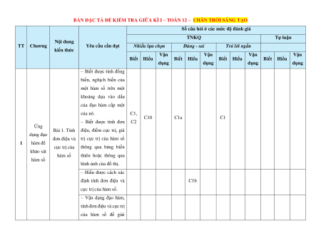BẢN ĐẶC TẢ ĐỀ KIỂM TRA GIỮA KÌ I – TOÁN 12 – CHÂN TRỜI SÁNG TẠO