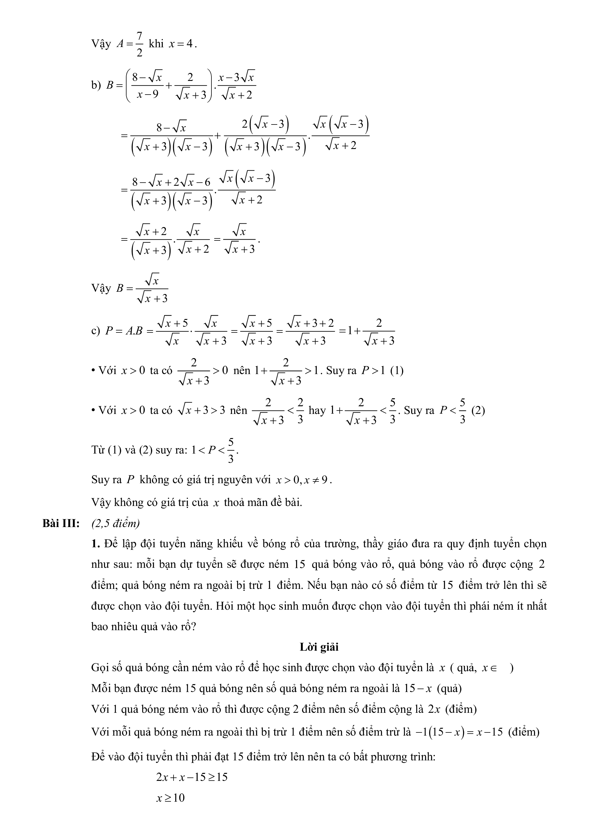 được chọn vào đội tuyển. Hỏi một học sinh muốn được chọn vào đội tuyển thì phái ném ít nhất bao nhiêu quả vào rổ? Lời giải