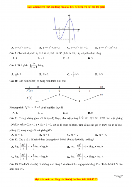 Câu 8. Cho hai số phức Số phức có phần thực bằng A. 1. B. C. D. 3. Câu 9. Tích phân bằng A. B. C. D.