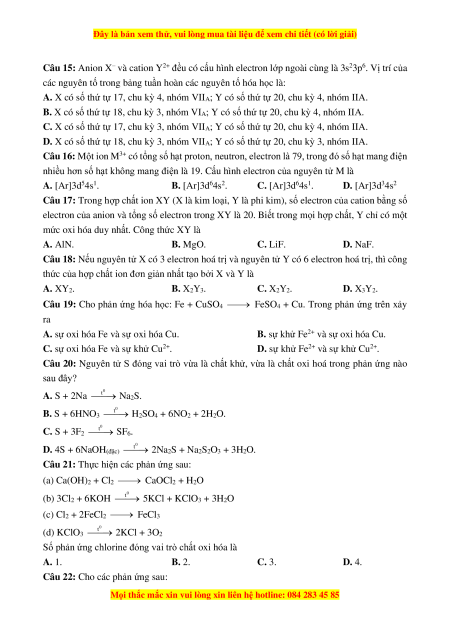 Câu 15: Anion X– và cation Y2+ đều có cấu hình electron lớp ngoài cùng là 3s23p6. Vị trí của
