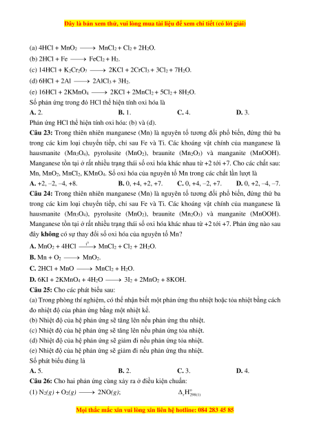 Câu 23: Trong thiên nhiên manganese (Mn) là nguyên tố tương đối phổ biến, đứng thứ ba