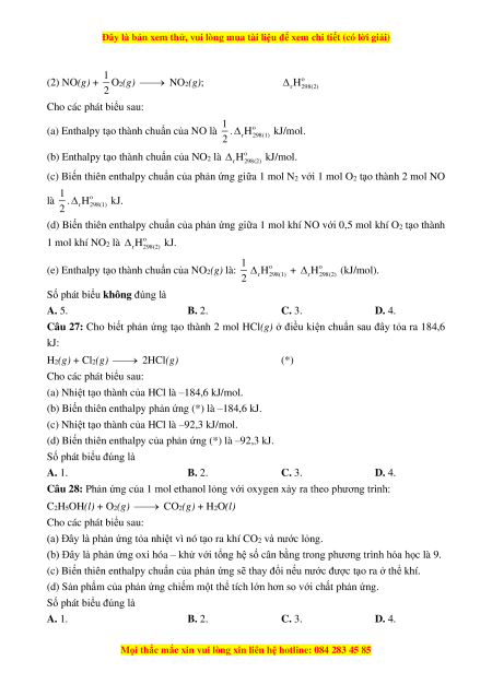 (e) Nhiệt độ của hệ phản ứng sẽ giảm đi nếu phản ứng thu nhiệt. Số phát biểu đúng là A. 5. B. 2. C. 3. D. 4.