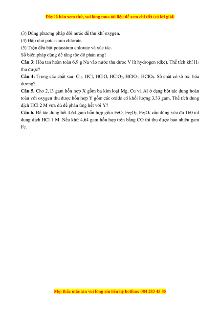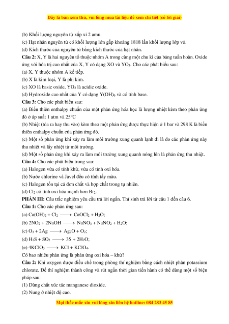 Câu 21: Thực hiện các phản ứng sau: (a) Ca(OH)2 + Cl2 ⎯⎯ → CaOCl2 + H2O 0 (b) 3Cl t ⎯⎯→ 2 + 6KOH 5KCl + KClO3 + 3H2O (c) Cl2 + 2FeCl2 ⎯⎯ → FeCl3 0 (d) KClO t ⎯⎯→ 3 2KCl + 3O2