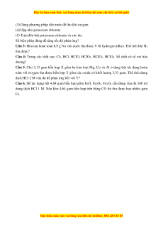 Câu 5: Oxygen (O) có khối lượng nguyên tử là 15,999 amu. Khối lượng 1 nguyên tử oxygen tính theo đơn vị gam là A. 26,566.10−24 gam. B. 26,665.10−24 gam. C. 26,656.10−24 gam. D. 26,556.10−24 gam.