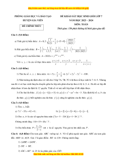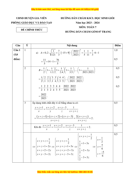 HƯỚNG DẪN CHẤM GỒM 07 TRANG Câu Ý Nội dung Điểm Câu 1 1 0 1 7 2022 1 1 7 1,0 a) A = 0, 2 : + 1 − 5 + 9 − = : + 6 −1 (5,0 121 3 2023 5 11 3 điểm) 11 76 0,5 = +14 −1 = . 5 5 2 1 1 1 1 1 0,5 B = . 1+ 1+ 1+ ..... 1+ 2 1.3 2.4 3.5 2021.2023