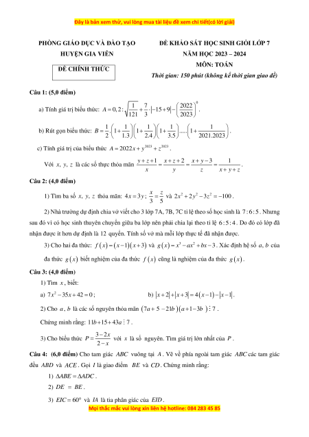 ĐỀ KHẢO SÁT HỌC SINH GIỎI LỚP 7 HUYỆN GIA VIỄN
