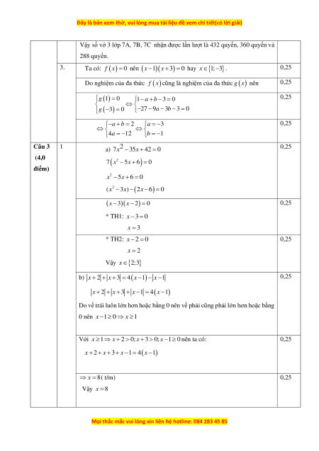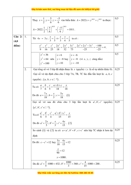 Gọi số vở dự định chia cho 3 lớp 7A, 7B, 7C lúc đầu lần lượt là: a, , b c (quyển) ; (a, , b c ) * . a b c a + b + c x 0,25 Ta có: = = = = 7 6 5 18 18 Do đó 7x x 5x a = ; b = ; c = . ( ) 1 18 3 18