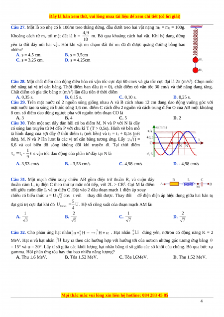Câu 28. Một chất điểm dao động điều hòa có vận tốc cực đại 60 cm/s và gia tốc cực đại là 2π (m/s