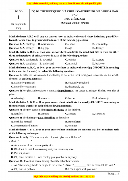 BỘ ĐỀ THI THPT QUỐC GIA CHUẨN CẤU TRÚC BỘ GIÁO DỤC & ĐÀO 1 TẠO
