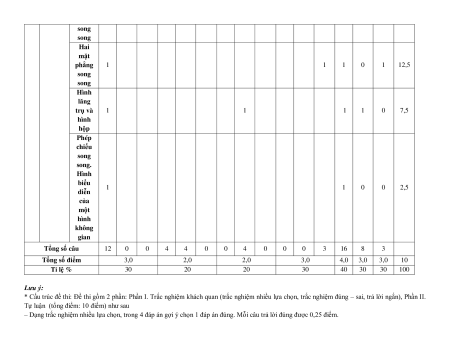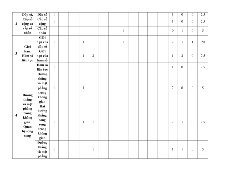 Mức độ đánh giá Tổng % Nội điểm dung TT Chương TNKQ Tự luận kiến Nhiều lựa chọn Đúng - sai Trả lời ngắn thức Vận Vận Vận Vận Vận Biết Hiểu Biết Hiểu Biết Hiểu Biết Hiểu Biết Hiểu dụng dụng dụng dụng dụng Góc lượng giác. Giá trị lượng 1 1 0 0 2,5 giác của góc lượng giác Hàm số Các lượng phép giác và biến 1 phương 1 1 0 0 2,5 đổi trình lượng lượng giác giác Hàm số lượng 1 1 0 1 1 15 giác và đồ thị Phương trình lượng 0 0 0 0 giác cơ bản Dãy số. Dãy số 1 1 0 0 2,5 Cấp số Cấp số 1 1 0 0 2,5 2 cộng và cộng cấp số Cấp số 1 0 1 0 5 nhân nhân Giới hạn của 1 1 1 1 2 1 1 20 Giới dãy số hạn. Giới 3 Hàm số hạn của 1 2 1 2 0 7,5 liên tục hàm số Hàm số 1 1 0 0 2,5 liên tục Đường thẳng và mặt phẳng 1 1 2 0 0 5 trong Đường không thẳng gian và mặt Hai phẳng đường trong 4 thẳng không song gian. 1 1 1 2 1 0 7,5 song Quan trong hệ song không song gian Đường thẳng 1 1 1 1 0 5 và mặt phẳng song song Hai mặt phẳng 1 1 1 0 1 12,5 song song Hình lăng trụ và 1 1 1 1 0 7,5 hình hộp Phép chiếu song song. Hình biểu 1 1 0 0 2,5 diễn của một hình không gian Tổng số câu 12 0 0 4 4 0 0 4 0 0 0 3 16 8 3 Tổng số điểm 3,0 2,0 2,0 3,0 4,0 3,0 3,0 10 Tỉ lệ % 30 20 20 30 40 30 30 100 Lưu ý: