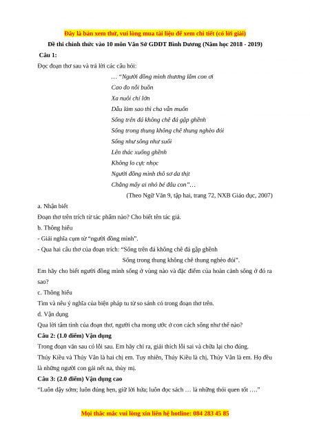 Đề thi chính thức vào 10 môn Văn Sở GDĐT Bình Dương (Năm học 2018 - 2019) Câu 1: