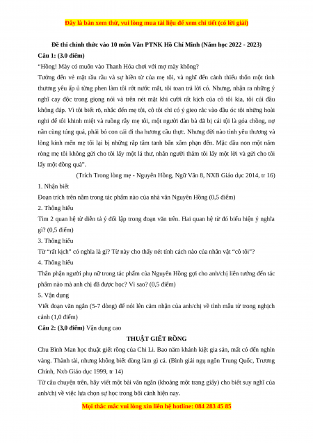 Đề thi chính thức vào 10 môn Văn PTNK Hồ Chí Minh (Năm học 2022 - 2023) Câu 1: (3.0 điểm)