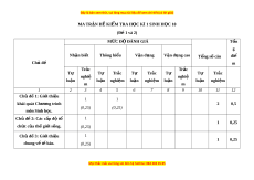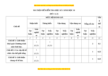 MA TRẬN ĐỀ KIỂM TRA H C Ọ KÌ 1 SINH H C Ọ 10 (Đề 1 và 2) M C Ứ Đ Đ Ộ ÁNH GIÁ T n ổ g Nhận bi t ế Thông hi u ể V n d ậ ng ụ Vận d ng cao ụ T ng s ổ ố câu điể Chủ đề m Trắc Trắc Tự Tự Trắc Tự Trắc Tự Tự Trắc nghiệ nghiệ luận luận nghi m ệ luận nghi m ệ luận luận nghi m ệ m m 1 2 3 4 5 6 7 8 9 10 11 12 Chủ đ 1: ề Gi i ớ thi u ệ 1 1 khái quát Chư ng ơ trình 2 0,5 (0,25) (0,25) môn Sinh h c. ọ Chủ đ 2 ề : Các c p đ ấ ộ tổ 1 1 0,25 chức của th gi ế i ớ s ng. ố (0,25) Chủ đ 3: ề Gi i ớ thi u ệ 1 1 0,25 chung về t bào. ế (0,25)