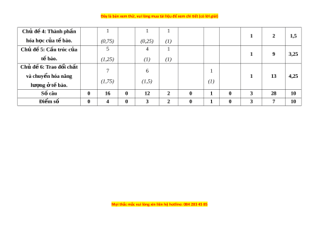 Chủ đ 4: ề Thành ph n ầ 1 1 1 1 2 1,5 hóa h c ọ c a t ủ bào. ế (0,75) (0,25) (1) Chủ đ 5 ề : Cấu trúc c a ủ 5 4 1 1 9 3,25 t bào. ế (1,25) (1) (1) Chủ đ 6 ề : Trao đ i ổ chất 7 6 1 và chuy n hóa năng ể 1 13 4,25 (1,75) (1,5) (1) lư ng ợ t ở bào. ế S câu ố 0 16 0 12 2 0 1 0 3 28 10 Đi m ể số 0 4 0 3 2 0 1 0 3 7 10