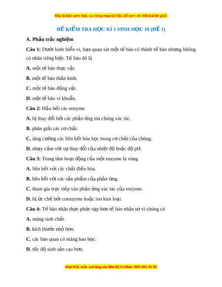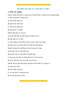 ĐỀ KIỂM TRA H C Ọ KÌ 1 SINH H C Ọ 10 (Đ 1 Ề ) A. Phần tr c nghi ắ m ệ Câu 1: Dư i ớ kính hi n ể vi, b n ạ quan sát m t ộ t ế bào có thành t ế bào nh ng ư không có nhân riêng bi t ệ . T bào đó l ế à A. m t ộ t bào ế th c v ự t ậ . B. m t ộ t bào t ế hần kinh. C. m t ộ t bào ế đ ng v ộ t ậ . D. m t ộ t bào ế vi khu n ẩ . Câu 2: Hầu h t ế các enzyme A. bị thay đổi b i ở các ph n ả ng m ứ à chúng xúc tác. B. phân gi i ả các c ch ơ t ấ . C. tăng cư ng ờ các liên k t ế hóa h c t ọ rong c ch ơ t ấ c a chúng. ủ D. nh y ạ c m ả v i ớ s t ự hay đổi c a nhi ủ t ệ đ ho ộ c ặ đ pH ộ . Câu 3: Trung tâm ho t ạ đ ng ộ c a m ủ t ộ enzyme là vùng A. liên k t ế v i ớ các ch t ấ đi u hòa. ề B. liên k t ế v i ớ các s n ả ph m ẩ c a ủ ph n ả ng. ứ C. tham gia tr c t ự i p vào ph ế n ả ng xúc t ứ ác c a ủ enzyme. D. bị c ch ứ ế b i