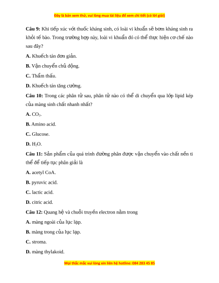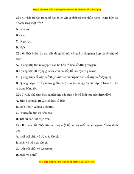 Câu 5: Phân t ử nào trong t ế bào th c ự v t ậ là phân t ử thu nh n ậ năng lư ng ợ b c ứ xạ t ánh ừ sáng m t ặ tr i ờ ? A. Glucose. B. CO2. C. Di p l ệ c. ụ D. H2O. Câu 6: Phát bi u