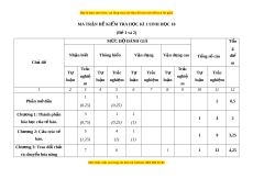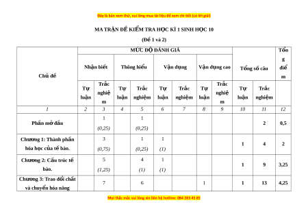 MA TRẬN ĐỀ KIỂM TRA H C Ọ KÌ 1 SINH H C Ọ 10 (Đề 1 và 2) M C Ứ Đ Đ Ộ ÁNH GIÁ T n ổ g Nhận bi t ế Thông hi u ể V n d ậ ng ụ Vận d ng cao ụ T ng s ổ ố câu điể Chủ đề m Trắc Trắc Tự Tự Trắc Tự Trắc Tự Tự Trắc nghiệ nghiệ luận luận nghi m ệ luận nghi m ệ luận luận nghi m ệ m m 1 2 3 4 5 6 7 8 9 10 11 12 1 1 Phần m đ ở ầu 2 0,5 (0,25) (0,25) Chư ng 1: ơ Thành ph n ầ 3 1 1 1 4 2 hóa h c ọ c a t ủ bào. ế (0,75) (0,25) (1) Chư ng ơ 2: C u t ấ rúc tế 5 4 1 1 9 3,25 bào. (1,25) (1) (1) Chư ng ơ 3: Trao đ i ổ ch t ấ 7 6 1 1 13 4,25 và chuy n hóa năng ể